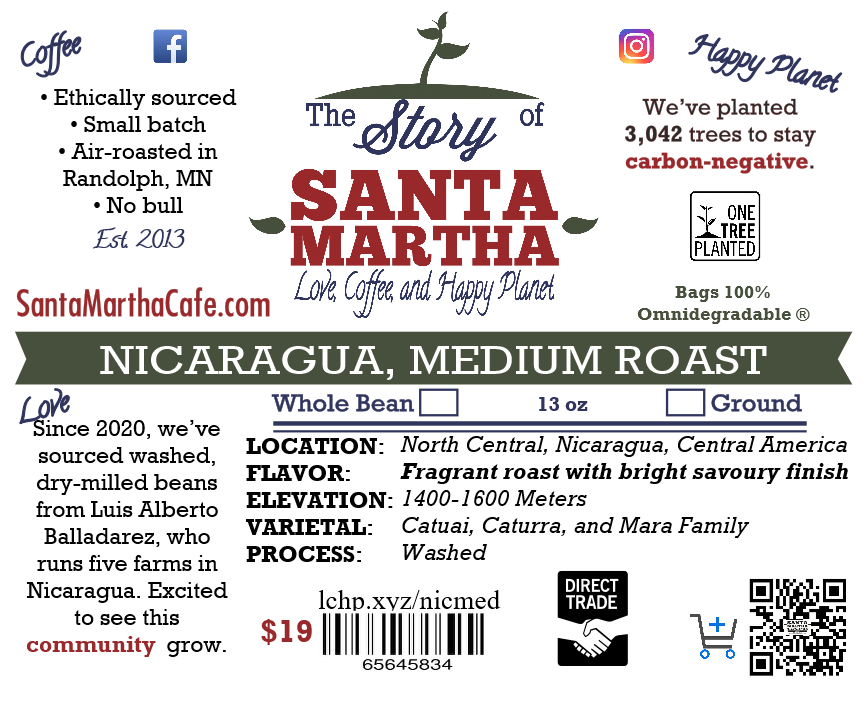 LOVE: Starting in 2020 we sourced these washed and dry milled beans from Luis Alberto Balladarez who owns and operates 5 farms in Nicaragua. Looking forward to watching this community grow.